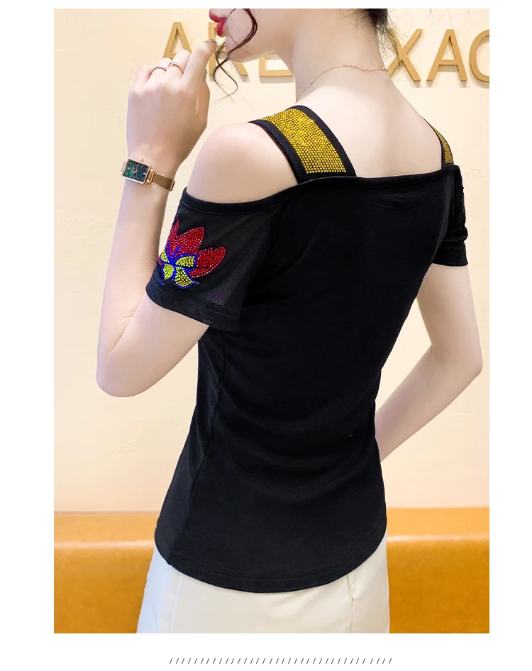 High-End Brand Women’s T-Shirt Clothes Luxury Shiny Cartoon Hot Diamonds Tops Summer Streetwear Girl Sexy Off Shoulder Tees