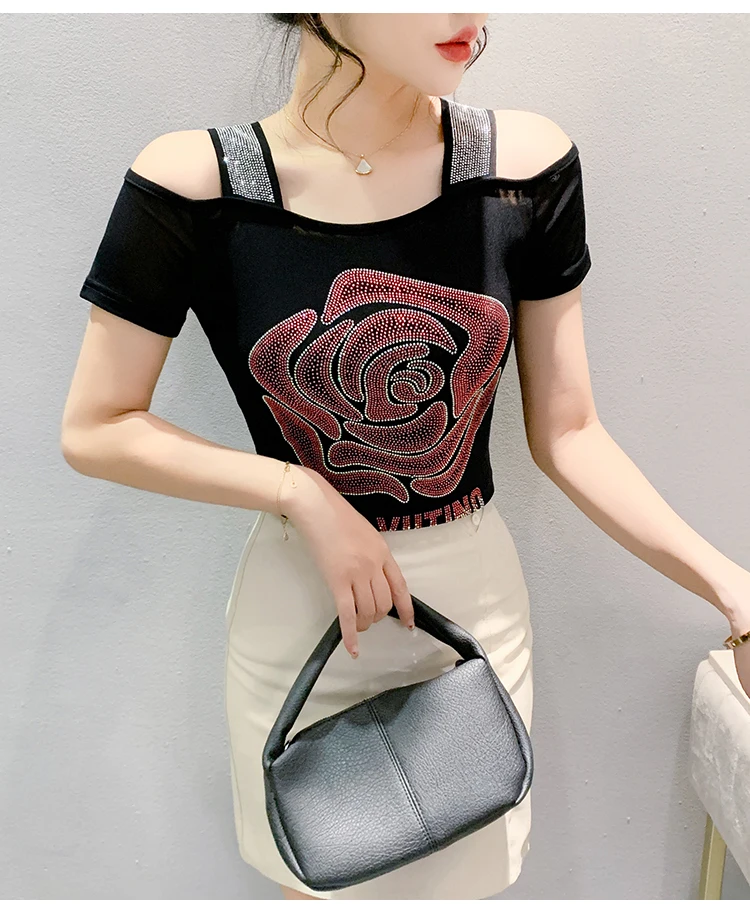 High Quality Summer Shiny Golden Rose Diamonds T-Shirts Women Sexy Off Shoulder Short Sleeve Top New Fashion Girl Slim Mesh Tees