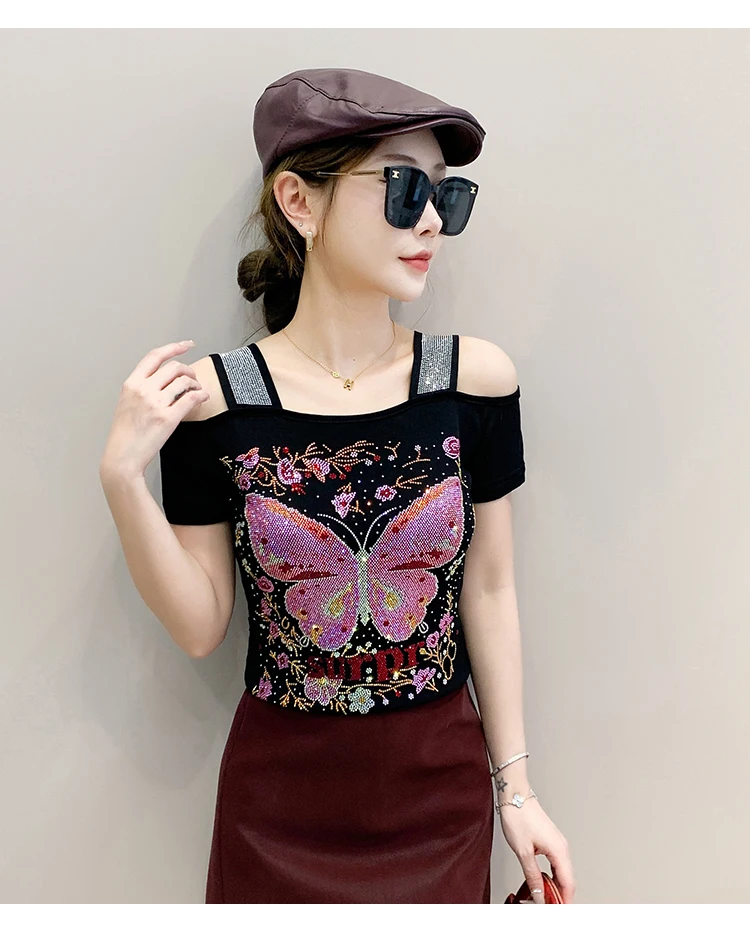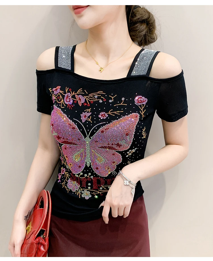 M-3XL Summer Women’s Luxury Hot Diamonds T-Shirt Chic Off Shoulder Short Sleeve Sexy Tees High Quality Ladies Slim Mesh Tops
