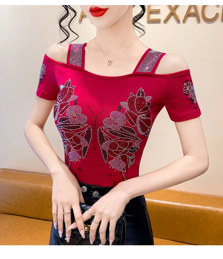 New Fashion Autumn European T-Shirt Clothes Women Chic Sexy Shiny Rose Diamonds Tops Short Sleeve Bottoming Shirt Tees Blouse